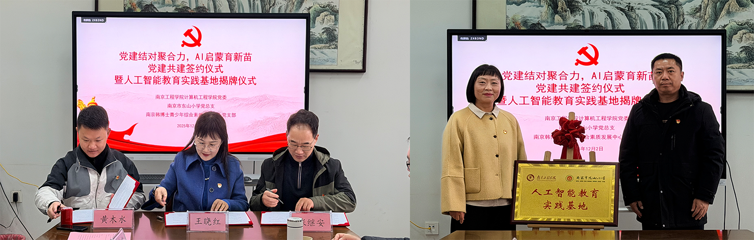 12月2日,计算机工程学院、南京市东山小学与南京韩博士青少年综合素质发展中心共同举办“党建结对聚合力 AI启蒙育新苗”党建共建签约仪式、人工智能教育实践基地揭牌仪式及AI科普研学活动,探索“校-地-企”协同育人新机制。学院党委书记王晓红,党委副书记、院长黄纬,东山小学党总支书记张继安、副校长陈琪,南京韩博士青少年综合素质发展中心党支部书记黄木水,理事长周岩以及东山小学30名学生代表参加活动。