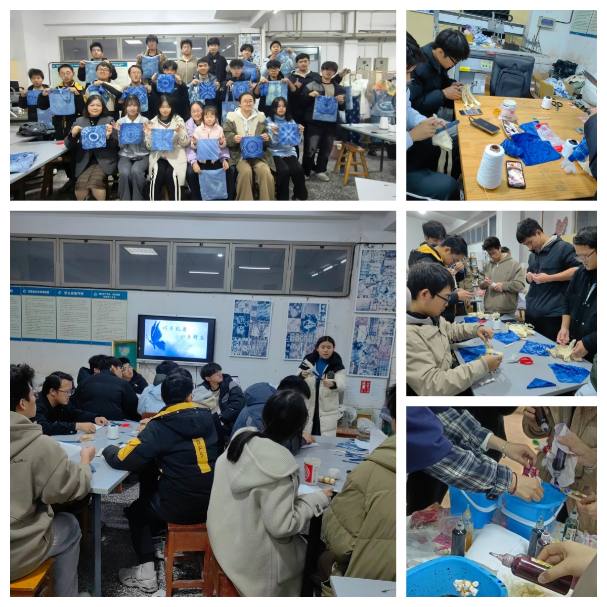 活动期间,指导老师系统讲解了扎染技艺的历史渊源与“捆扎防染”的核心原理,并演示了折叠、捆扎、浸染等关键工艺流程,强调了安全操作规范。在实践环节,同学们发挥创意,通过不同的折叠与捆扎方式在方巾与布包上设计纹样,沉浸于专注的手工创作过程。同学们纷纷表示,通过亲身参与扎染制作,不仅领略了非遗艺术的魅力,也在专注创作中有效舒缓了压力,获得了积极的心理体验。