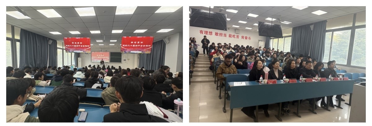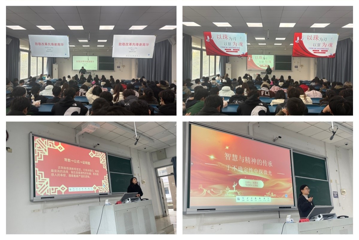 马克思主义学院黄成亮、郝敏、朱莎、朱梦菲四位老师应邀担任主讲,他们紧扣党的二十届四中全会精神,结合各自研究专长进行了专题讲授。黄成亮以“改革先锋谢高华”为例,生动诠释了“闯、创、干”的改革担当;郝敏回顾了“两弹一星”研制中“算盘大军”的感人事迹,展现了数理人“以珠为刃、以算为魂”的报国情怀;朱莎以“常数、公式与证明题”为隐喻,解读了中国共产党人精神谱系中的理性执着与价值追求;朱梦菲则运用贝叶斯公式分析四渡赤水中的战略智慧,揭示“在不确定性中探微光”的科学思维与信念力量。
