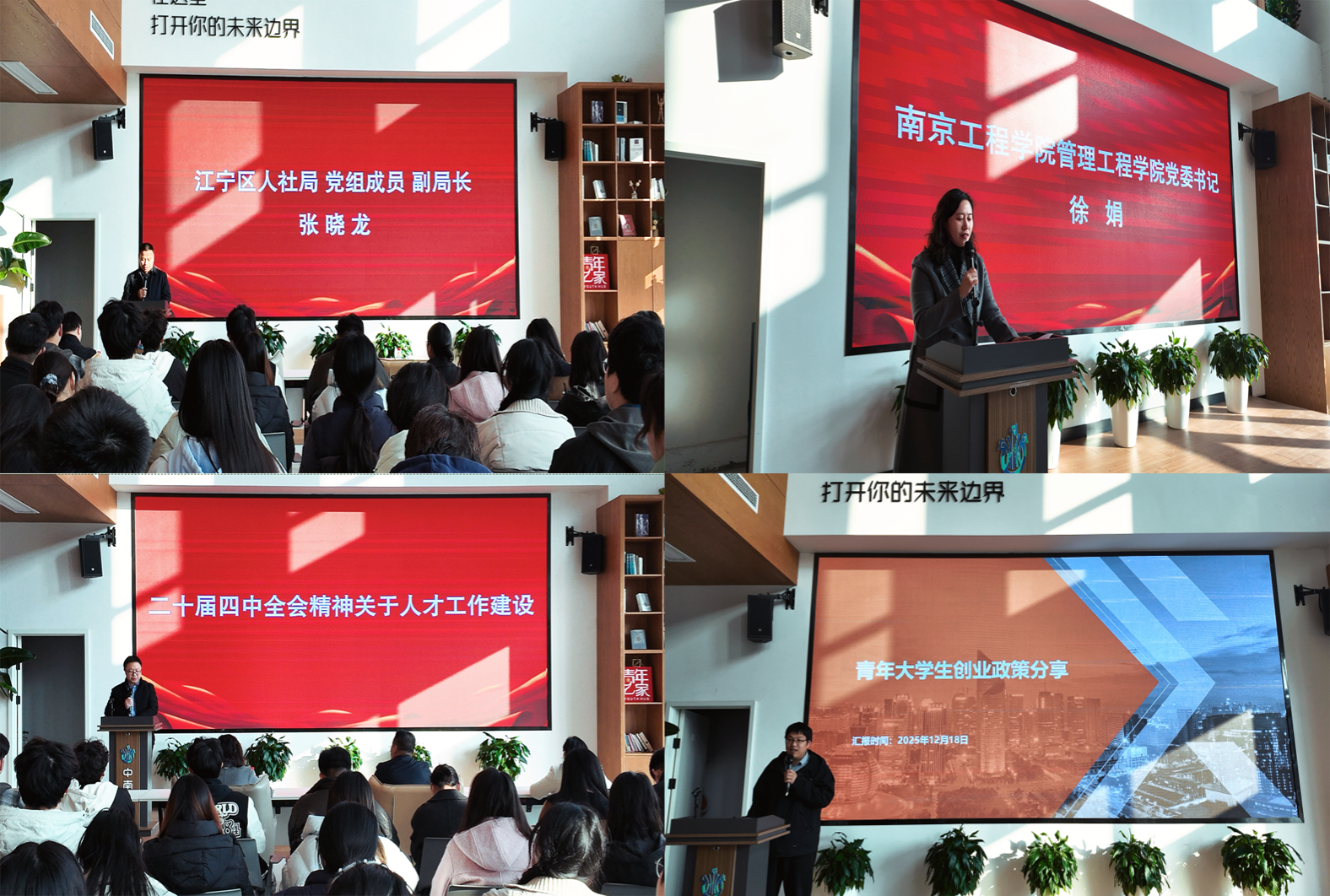 会上,张晓龙系统介绍了江宁区产业布局、人才引进政策及就业创业环境,为学生未来的职业规划与发展提供了清晰的政策指引。徐娟介绍了学院在学科建设、人才培养与社会服务方面的主要成效,强调学院始终以服务地方经济发展为导向,着力培养高素质管理类人才。许发磊结合学习贯彻党的二十届四中全会精神,聚焦“人才强国”战略,引导师生深入理解新时代人才工作的重要意义与实践要求。在交流互动环节,江宁区人社局工作人员面向同学们开展了就业创业政策宣讲与指导,围绕就业实习、人才落户、政策补贴等常见问题进行了细致解答。