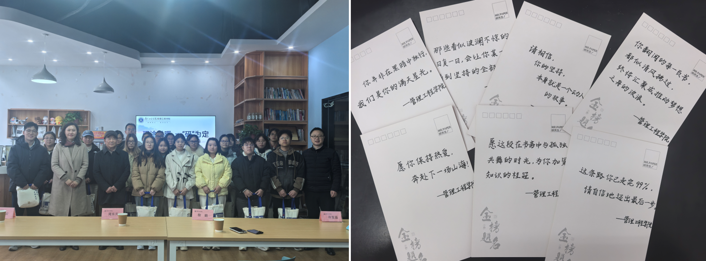 近日,考研进入最后冲刺阶段,备考学生的心理状态成为管理工程学院重点关注的问题。学院近期推出一系列暖心举措,从精神支持到实际关怀,为备考研学子提供全方位的陪伴与保障。