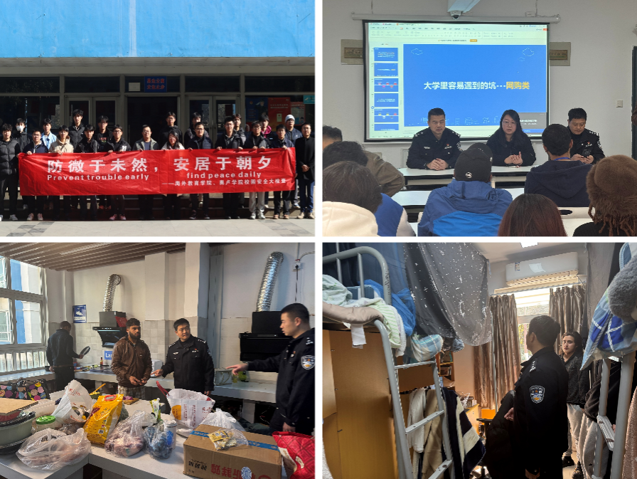 筑牢安全防线,强化预警排查。学院高度重视假期安全,在1月9日、13日先后开展校园安全检查及留学生宿舍专项排查,联合南京市公安局江宁分局民警逐间排查用电规范、消防设施等安全隐患,并建立台账闭环整改。学院还组织开展反诈专题讲座,发布留校安全须知,指导学生填写留校申请表,全面掌握学生动态,做到防患于未然。