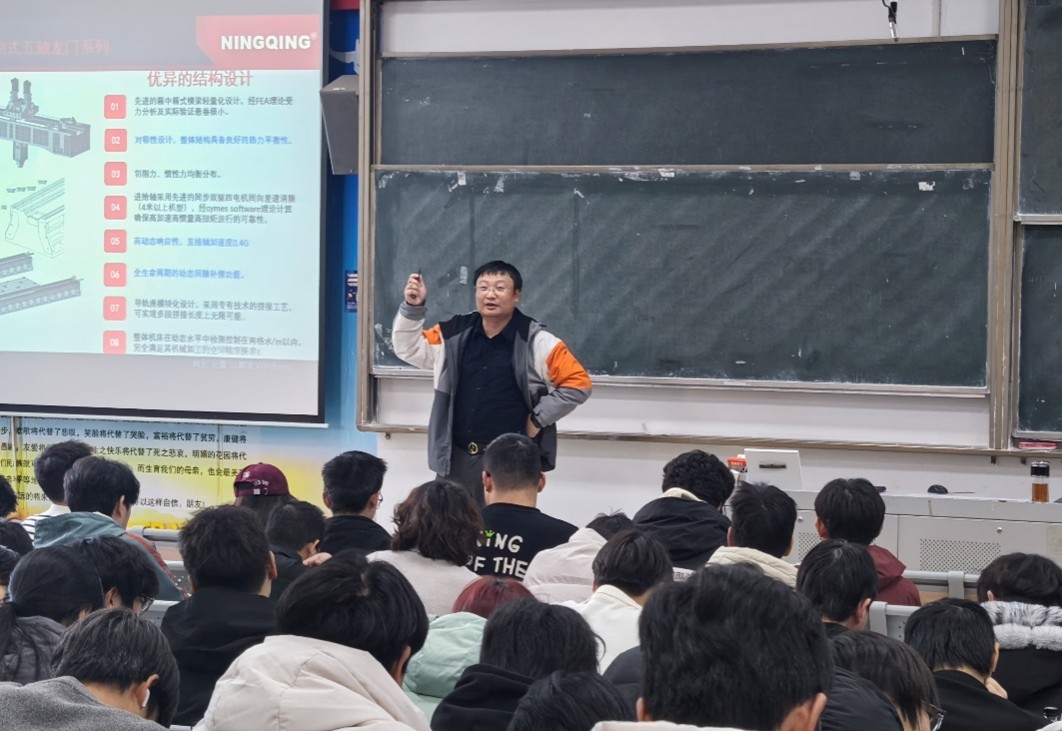 课程中,蔡晶教授介绍了机械类专业特点,以工业母机“一台床”为例,系统讲解了机床结构设计、制造装配、数字孪生等技术知识。他结合公司服务国产大飞机C919、运20等国家项目的实践,分析了工业母机制造业的现状与趋势,鼓励同学们努力学习,担当制造强国责任,在学好专业知识的同时注重沟通协作、持续学习等能力的培养,并表示将进一步深化与学院的合作,持续关注并支持学院在高端装备领域的人才培养与科研创新工作。