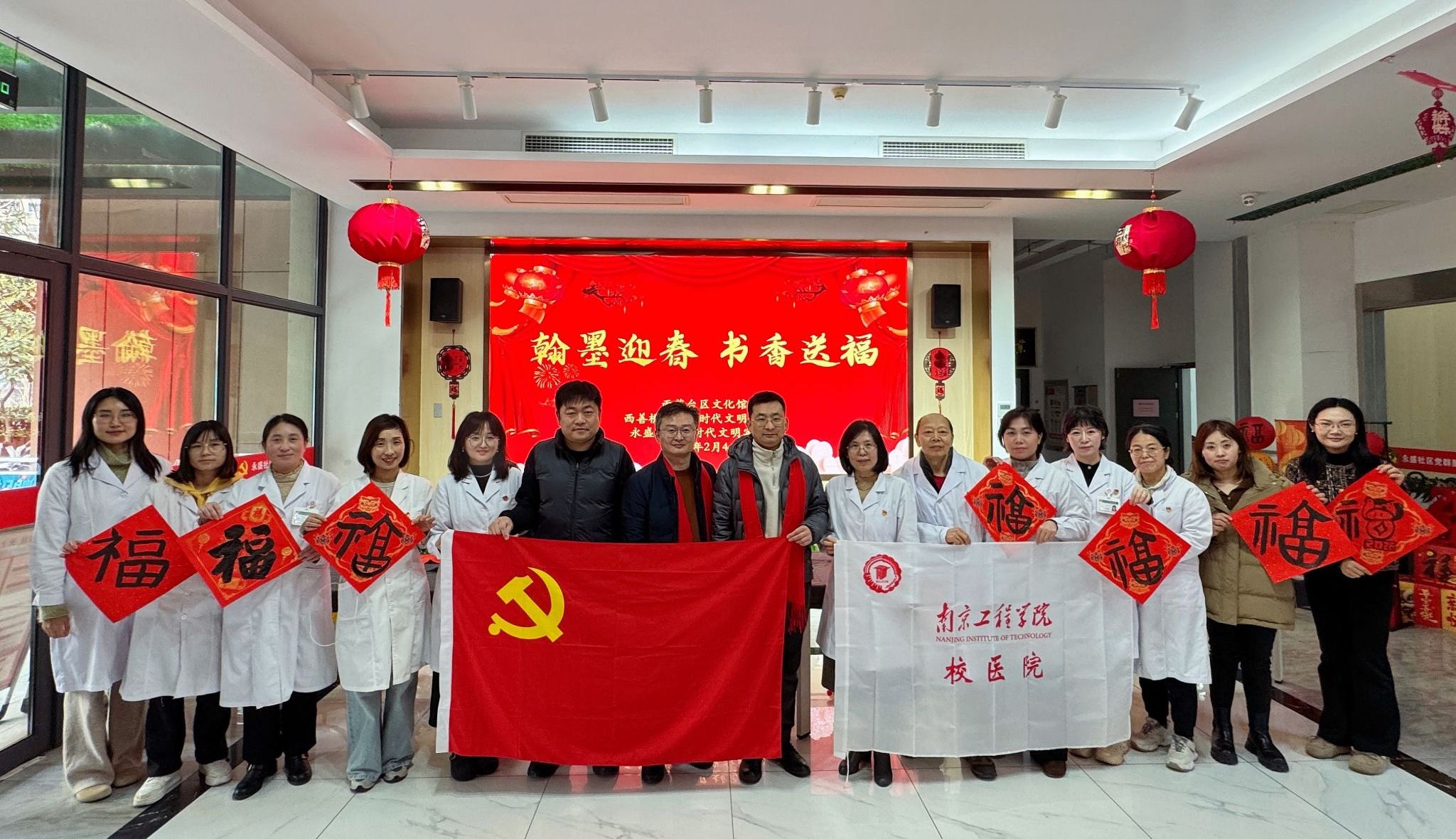 2月4日下午,校医院直属党支部书记、院长叶长青带队赴雨花台区西善桥街道永盛社区开展暖心公益服务暨写春联活动。我校2010级校友、永盛社区党总支书记霍佰义参加活动。