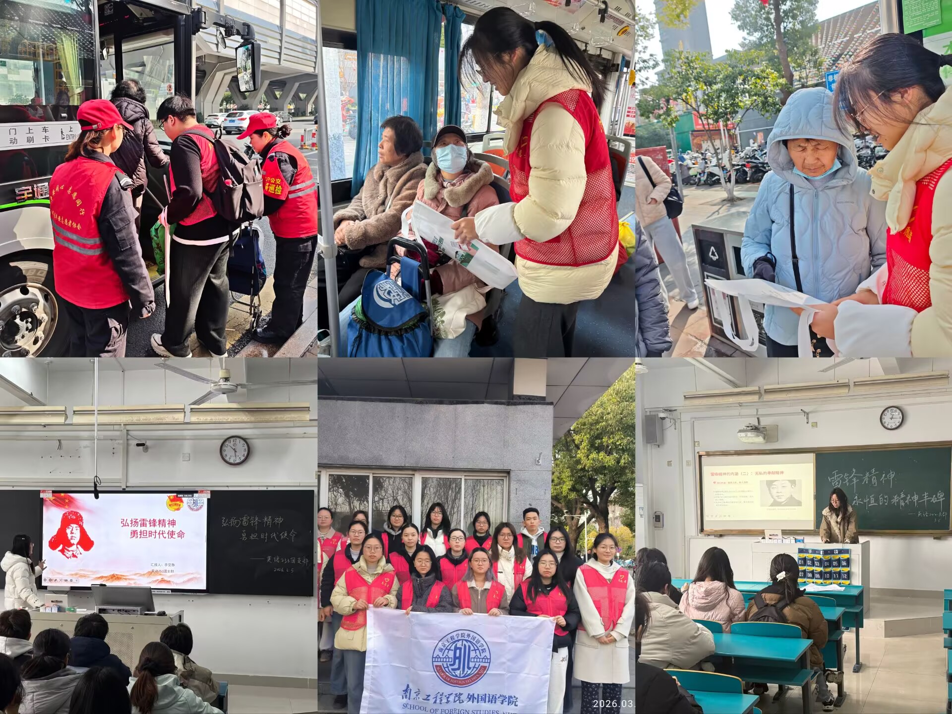 学院师生联合江宁公交集团巡检工作人员,开展“文明交通 青春护航”志愿服务。志愿者们分组参与随车安全检查、隐患排查,协助推广“宁易行”智慧出行软件。在客流密集站点,同学们主动搀扶老年乘客、帮忙搬运行李、耐心解答换乘疑问,将暖心服务送到乘客身边。此外,学院组织各团支部开展主题团课教育活动,通过重温雷锋日记、观看纪录片、分享身边好人好事等形式,引导学生在理论学习与事迹交流中感悟雷锋精神内涵。同学们表示,要将雷锋精神内化于心、外化于行,争做“永不生锈的螺丝钉”。