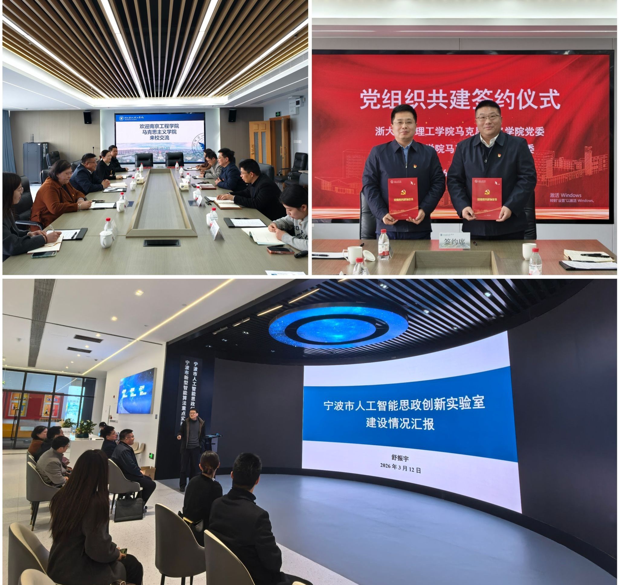 在浙大宁波理工学院,马克思主义学院党委书记伍醒介绍了学院教学科研及思政人工智能实验室建设成果,重点展示“宁理红”党建品牌的内涵与运作机制。双方围绕思政课教学改革、实践教学创新、人工智能赋能思政教育等议题深入研讨,并签署党建共建协议,建立常态化合作机制,共同探索应用型高校马克思主义学院发展新路径。学院一行实地参观宁波市人工智能思政创新实验室,详细了解“甬红大脑”智能思政系统运行情况,学习运用大数据、沉浸式技术解决思政教育痛点的先进经验。