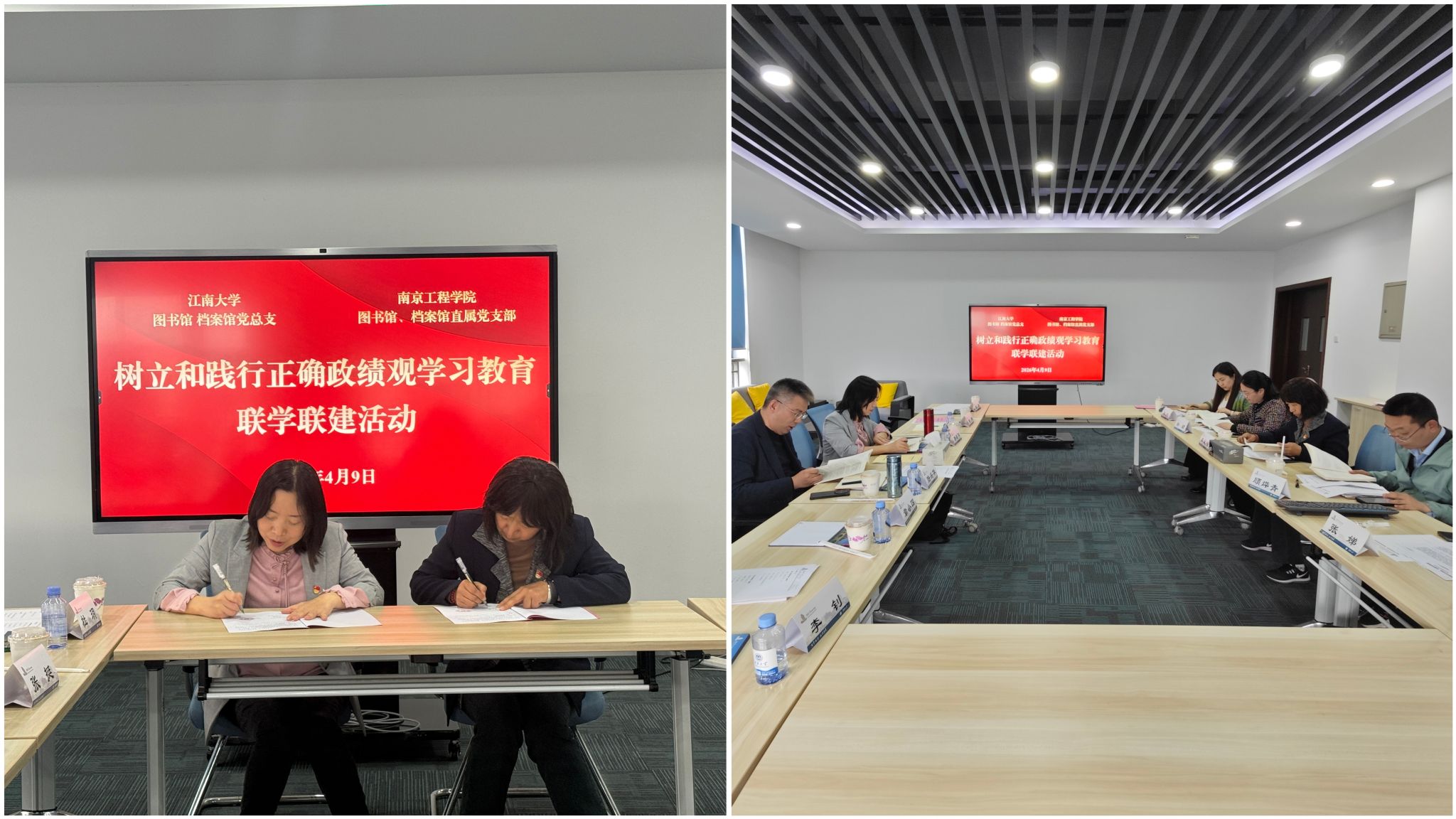 下午,团队前往江南大学图书馆、档案馆开展联学共建。双方签订党建联创共建协议,举办树立和践行正确政绩观学习教育专题读书班,班子成员领学《习近平关于树立和践行正确政绩观论述摘编》重点章节,并结合实际深入研讨。江南大学图书馆、档案馆党总支书记李凤梅、副馆长顾烨青分享了人力资源创新管理、书香校园建设、学科与知识产权服务、校友学籍档案远程利用等经验。双方就党建与业务深度融合、以正确政绩观引领服务提质增效展开讨论,并达成多项合作意向。调研团队还参观了江南大学图书馆密集书库,了解其高效智能的藏书管理模式。