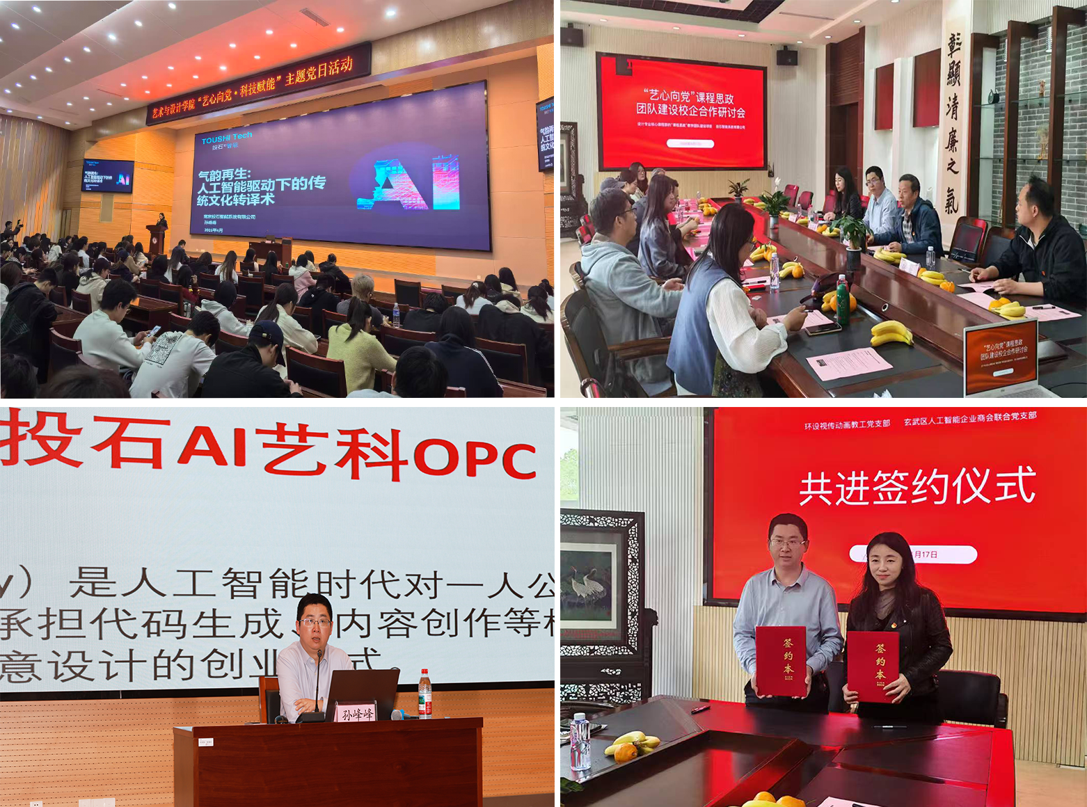 会上,孙峰峰作“人工智能驱动下的传统文化转译术”专题讲座,聚焦AIGC技术前沿与文化遗产活化,阐述了人工智能在传统文化数字化、IP转化等方面的关键作用。校企双方就AIGC与课程思政结合、AI数字艺术设计微专业人才培养等议题研讨,在多方面达成合作意向。环设视传动画教工党支部与玄武区人工智能企业商会联合党支部签订党建共建协议。